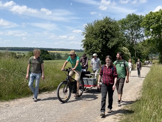 Wenn Engel reisen, lacht der Himmel – Gemäß diesem Motto strahlte am 12. Juni die Sonne, als sich etwa 20 Menschen auf dem Hof von Lotta Karotta einfanden, dem Ausgangspunkt für eine mit verschiedenen Infostationen gespickten Rundwanderung um das Dorf Rittmarshausen im hinteren Gartetal. Der Einladung der Gleichener Grünen waren u.a. Pippa Schneider, Landtagskandidatin der Grünen für den Wahlkreis, zu dem auch Gleichen gehört, Mitglieder verschiedener Parteien im Rat der Gemeinde und interessierte MitbürgerInnen gefolgt.